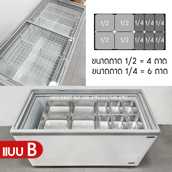 ตู้แช่เเข็งกระจกเรียบ ตู้แช่ไอศครีม ประกอบด้วย 1. ตะกร้าสำหรับวางถาดสแตนเลสขนาด1/2 (วางเซต2ใบ/ตะกร้า) จำนวน 2 ตะกร้า 2. ตะกร้าสำหรับวางถาดสแตนเลสขนาด1/4 (วางเซต2ใบ/ตะกร้า) จำนวน 1 ตะกร้า 3 ตะกร้าสำหรับวางถาดสแตนเลสขนาด1/4 (วางเซต4ใบ/ตะกร้า) จำนวน 1 ตะกร้า 4. ถาดขนาด ½ จำนวน 4 ถาด 5 .ถาดขนาด ¼ จำนวน 6 ถาด |