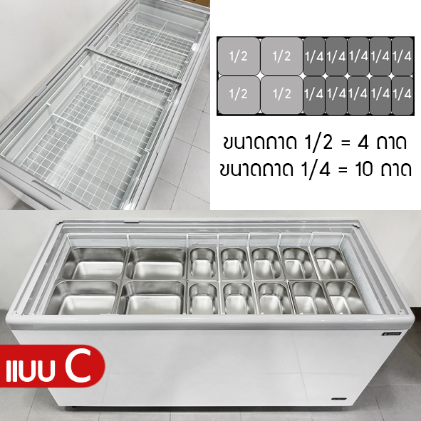 ตู้แช่เเข็งกระจกเรียบ ตู้แช่ไอศครีม ประกอบด้วย 1. ตะกร้าสำหรับวางถาดสแตนเลสขนาด1/2 (วางเซต2ใบ/ตะกร้า) จำนวน 2 ตะกร้า 2. ตะกร้าสำหรับวางถาดสแตนเลสขนาด1/4 (วางเซต2ใบ/ตะกร้า) จำนวน 5 ตะกร้า 3. ถาดขนาด ½ จำนวน 4 ถาด 4.ถาดขนาด ¼ จำนวน 10 ถาด |